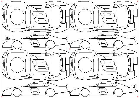 Race Car e2e for Longarm Quilting. Picture shows two repeats per row with two rows. Vertical Spacing is 0.0. Actual width is 12.0 inches and actual height is 8.5 inches. Note, cars are rubbing as often noted in NASCAR Racing. Downloadable file offered in qli or iqp format.